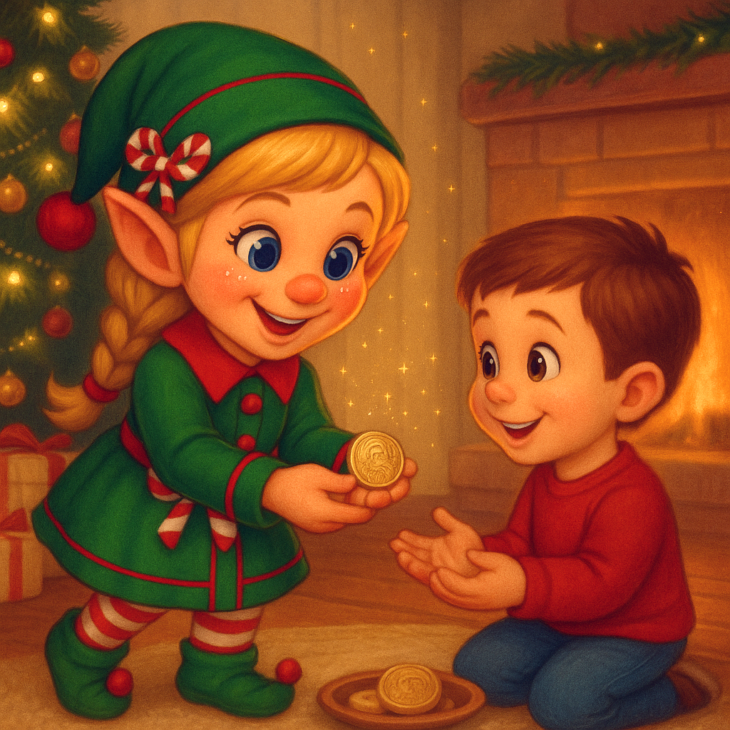 Elfi überreicht eine ganz besondere Wunschmünze aus der Werkstatt des Weihnachtsmanns.